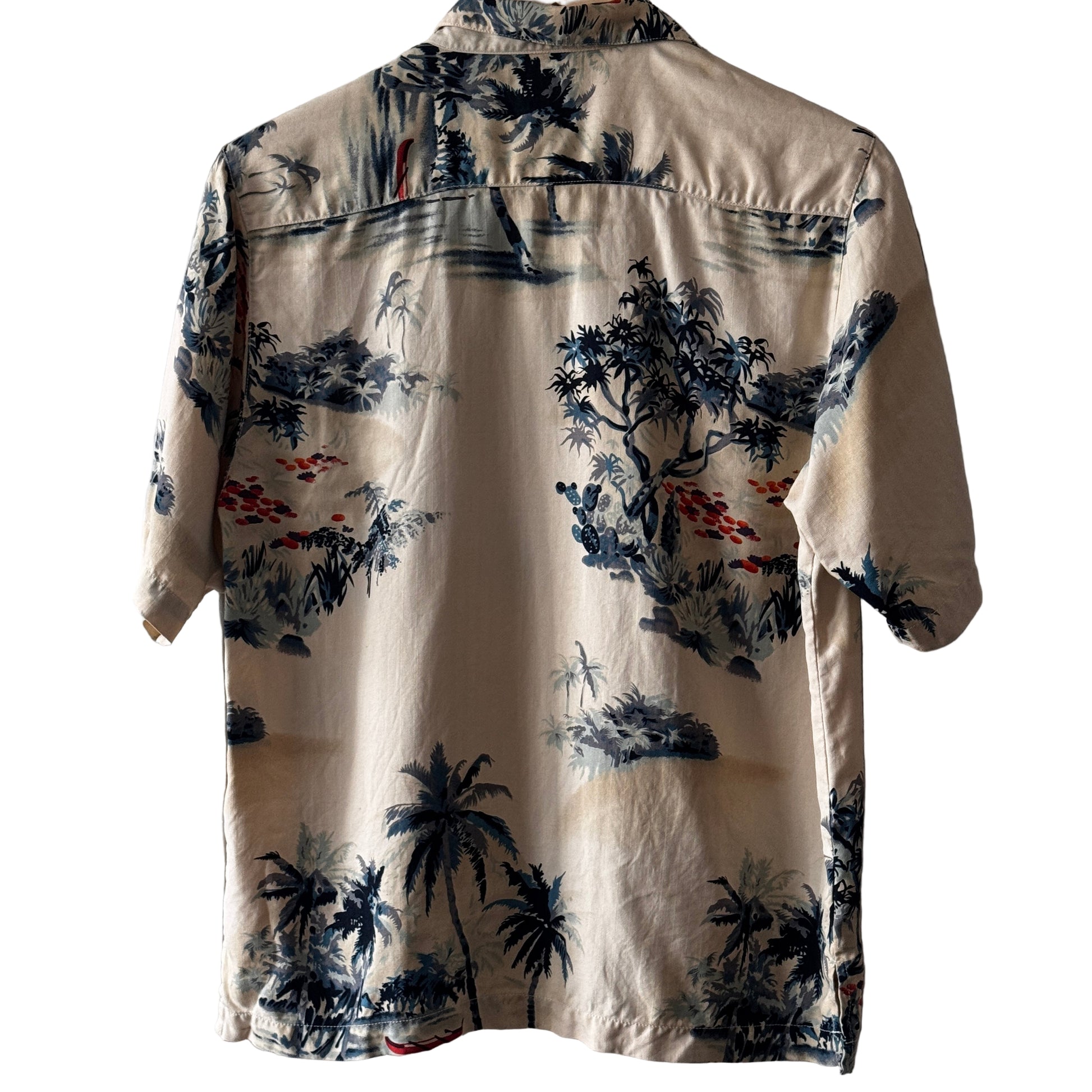 Tommy Bahama Silk Aloha Men’s Shirt Small Beige Tropical Palm Tree Button-Down Retro Vacation Button up Shirt