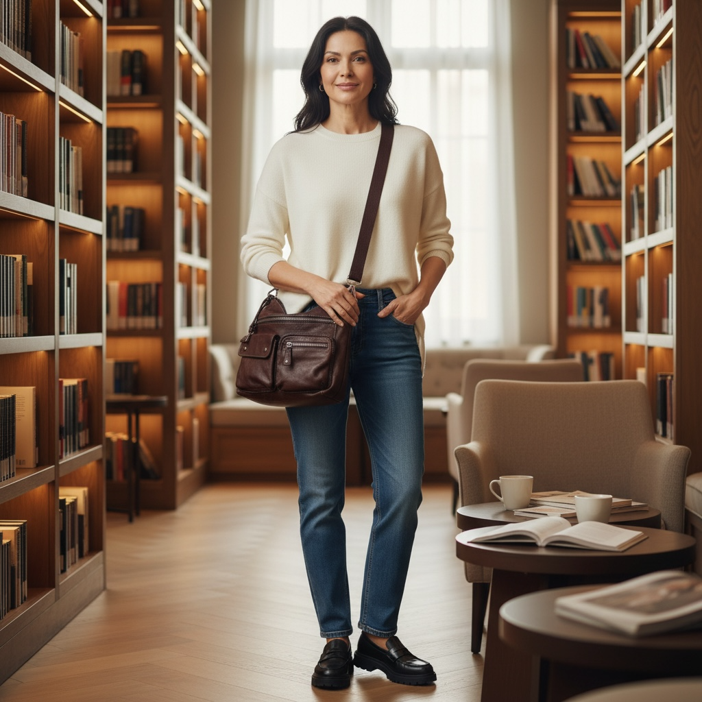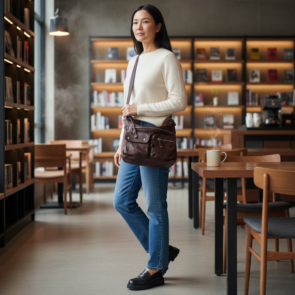 - Vibe: Bookstore girl • cozy academia • rugged retro leather • everyday practicality