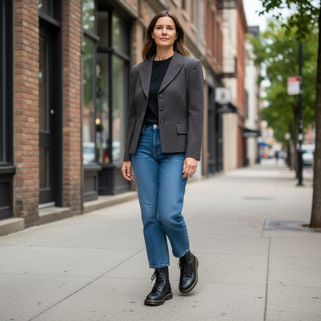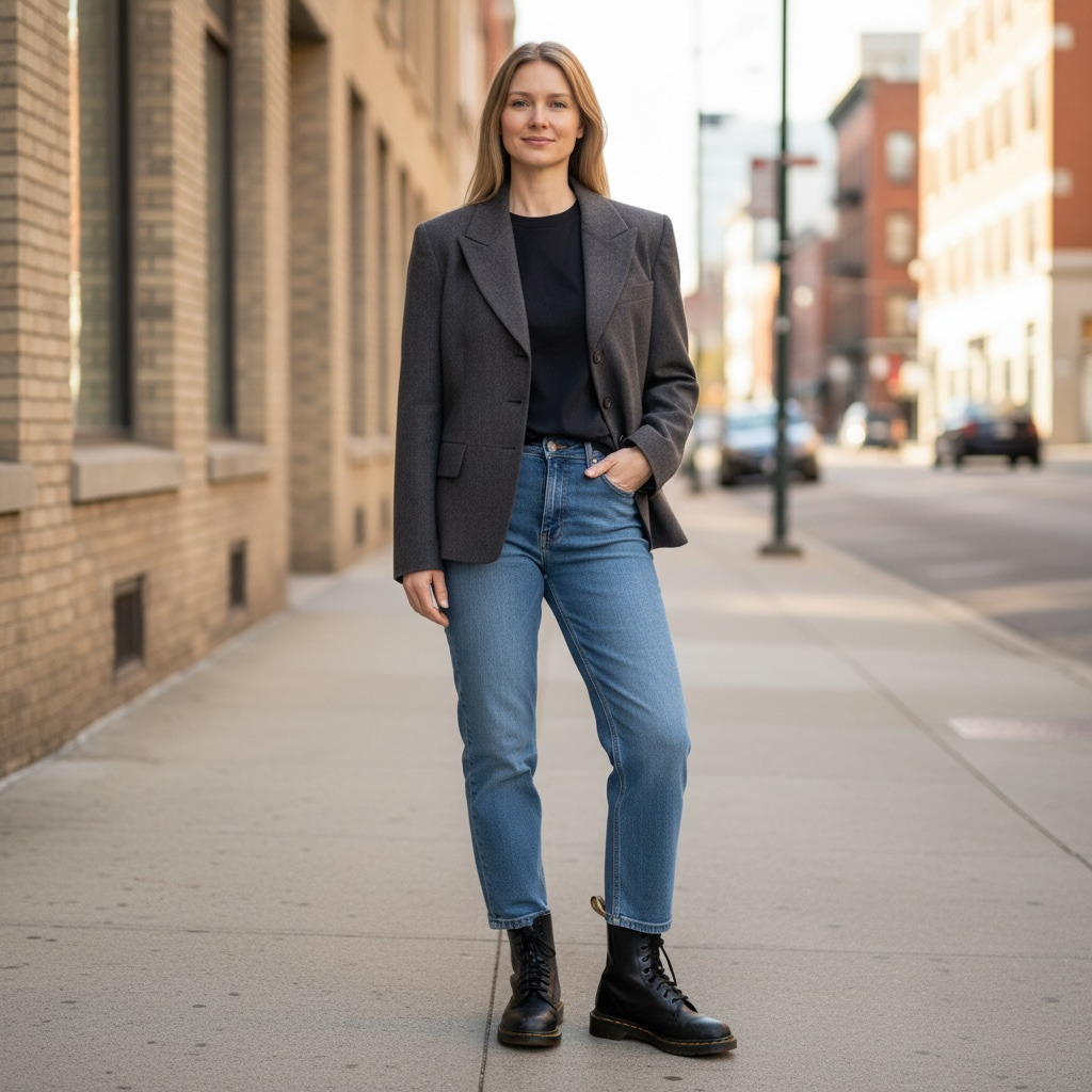 This piece features a clean notched lapel, three-button front, petite cut, and a slightly cropped silhouette that pairs effortlessly with high-waisted trousers, denim, or skirts.