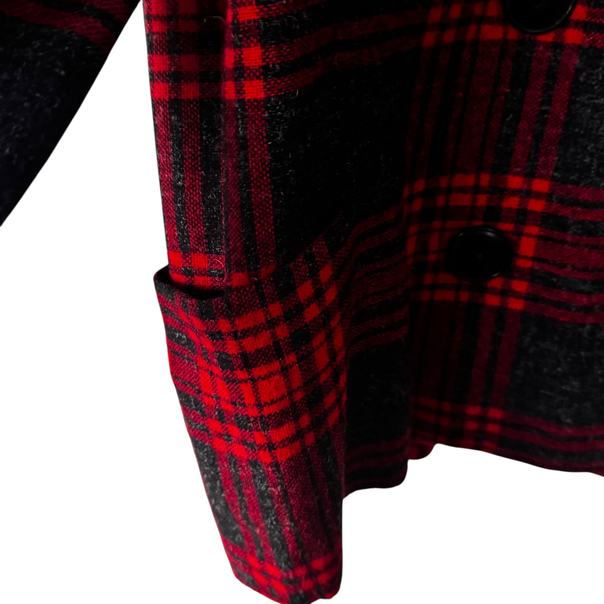 Step into classic vintage style with this striking Steven Michaels red and black plaid blazer, made in the USA. Crafted from a warm wool-blend fabric, this double-breasted jacket features sharp lapels, structured shoulders, and a timeless tartan pattern that’s perfect for fall and winter.